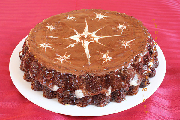 Украсить торт Снежинка можно по-разному: обсыпать весь белой кокосовой стружкой или нанести рисунок растопленным белым шоколадом, цветной стружкой. Я решил использовать трафарет с рисунком снежинки. Обсыпал через трафарет порошком какао.
