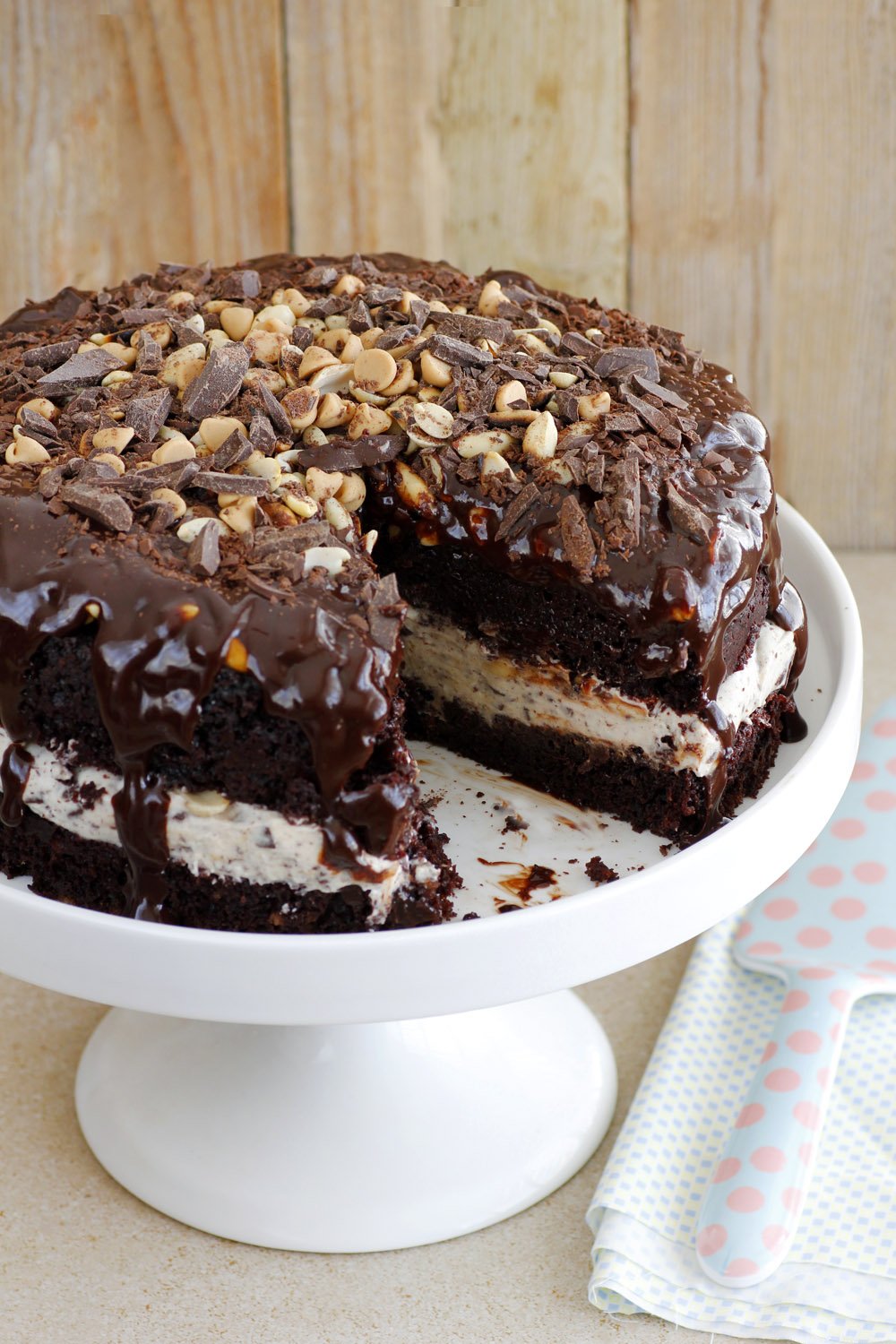 Убедитесь, что ваши глаза находятся на одном уровне с тортом, чтобы убедиться, что он ровный. Сбрызните нугу небольшим количеством соленой карамели.
