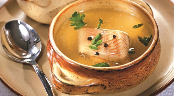 Рыба извлекается из бульона и выкладывается отдельно, а отборные кусочки находятся в тарелке.