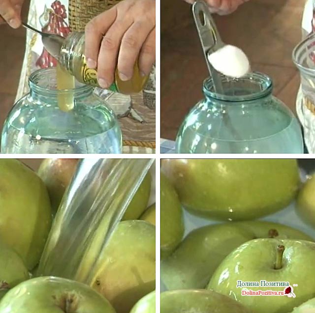 Сам процесс консервирования яблок предельно прост. Сперва сложите фрукты в подготовленные стерильные теплые банки. Пусть плоды лежат плотно друг к другу. Теперь залейте яблоки крутым кипятком, закройте специальной капроновой крышкой с дырочками и оставьте в таком виде на 30 минут.