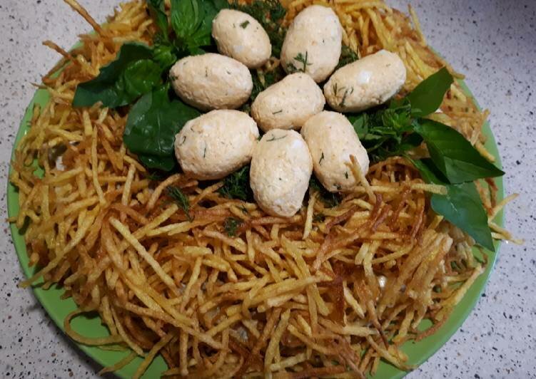 Края блюда оформляем картошкой фри и в центр помещаем нашу красоту – оригинальные яички;