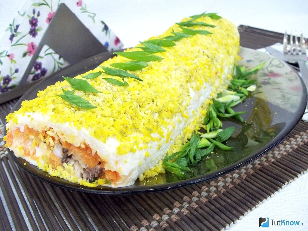 - Последним слоем выкладываем натертые яичные желтки. Салат накрываем пищевой пленкой и оставляем на время пропитаться.