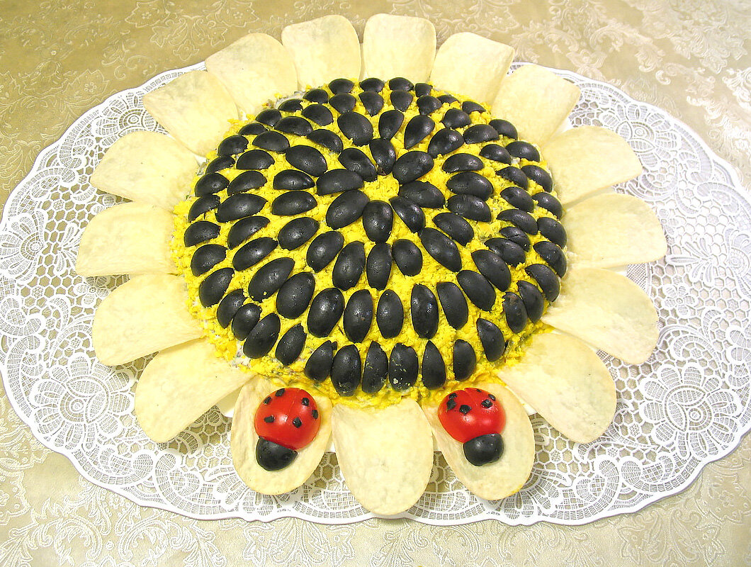 Божьи коровки из помидоров – одно из основных украшений для всеми любимого салата подсолнух, представляющий собой одноименный цветок. Приготовить и оформить его удивительно просто, а на столе он смотрится просто бесподобно. Если вы давно думали, как еще можно украсить ваш «подсолнух», то следующие фото подарят вам несколько свежих идей.