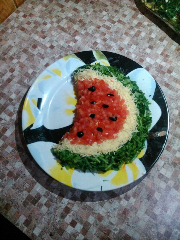 3. Берем большое блюдо и на нем укладываем салатную массу в виде арбузной дольки.