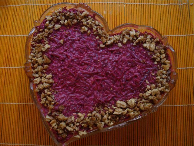 - На сыр помещает орехово-свекольную массу, мажем майонезом;