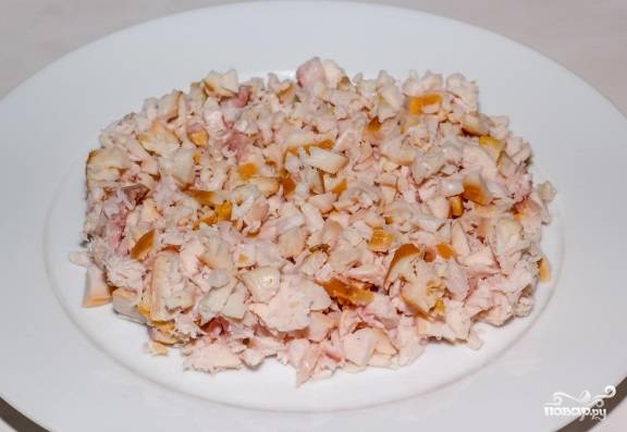 Разбираем копченую курицу, удаляя с нее кости, жилки, лишний жир и шкуру (для тех кто ее не любит, лично я ее ем, поэтому она у меня немного присутствует). Разобранные куски птицы нарежем небольшими кусочками (около 0,5 куб. см.),