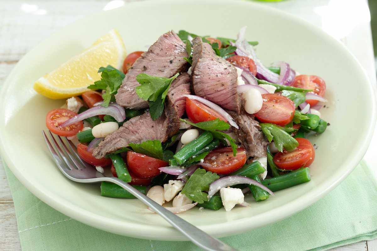 Непосредственно перед подачей летний салат из свежих овощей и мяса можно полить с лимонным соком, а говядину отварить или же запечь в духовке завернув в фольгу.